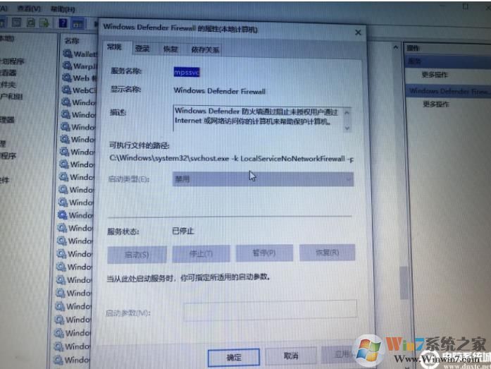 3、修改注册表之后,重启一下电脑,我们就可以回到服务中查看此时Windows defender firewall服务已经是禁用状态,如果要恢复启动,那么回到注册表把start值改成2即可。