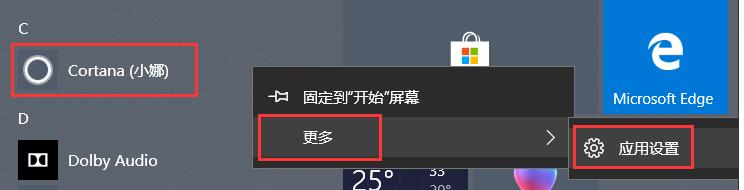 1、点击开始菜单,找到小娜(Cortana),在小娜上单击右键,选择【更多】–【应用设置】;