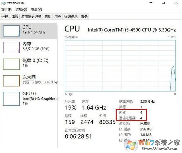 在任务管理器中,我们查看内核就是物理核心,逻辑处理器就是线程,如下是四核四线程的一款处理器,此外我们还可以借助CPU-Z或者鲁大师来查看核心数量和线程数量。