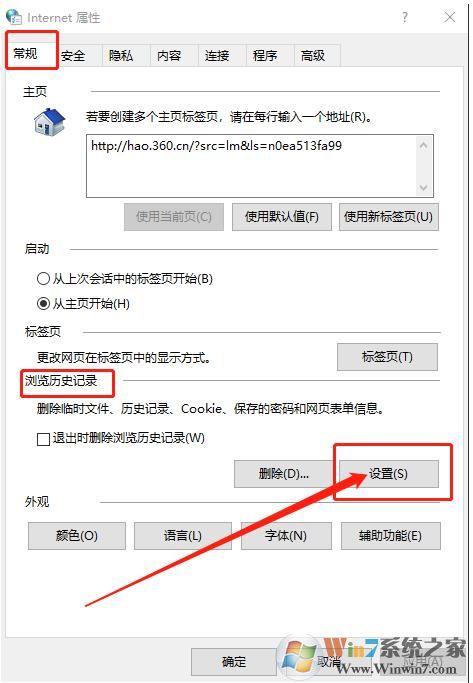 3、进入属性窗口后,在“常规”选项卡中,点击浏览历史记录-“设置”