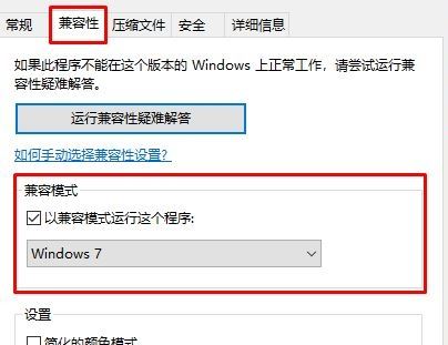 2、打开软件的属性界面之后,切换到【兼容性】选卡,在下面将【兼容模式】下勾选【以兼容模式运行这个程序】,然后在下拉菜单中选择“Windows 7”系统,最好的话在下面勾选【以管理员身份运行】,点击确定保存设置,如下图所示: