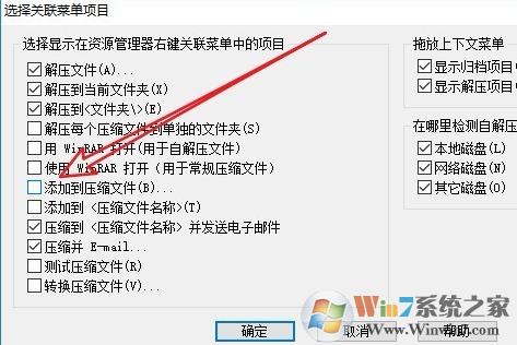 6、这时就会弹出“选择关联菜单项目”的窗口,在这里我们勾选“添加到压缩文件”前面的复选框