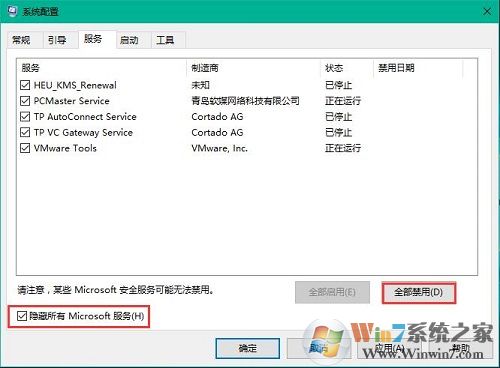 3、接着将界面切换到服务栏界面,首先点击勾选“隐藏所有Microsoft服务”然后再点击“全部禁用”按钮,如下图所示: