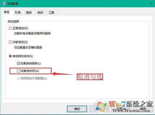 2、在打开的系统配置窗口中,在常规选项卡下点击“有选择的启动”,取消勾选“加载启动项”,如下图所示: