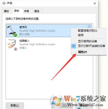 3、在这里可以看到我们的麦克风设备是否在工作,右键默认麦克风,选择属性;