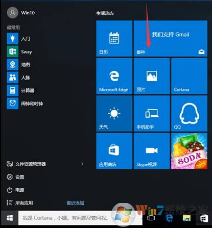 一、打开Win10系统开始菜单,点击“邮件”;