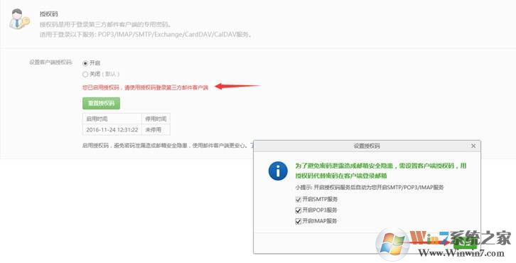 九、看到提示:您已启用授权码,请使用授权码登录第三方邮件客户端(同时开启POP3\IMAP服务)点击确定;