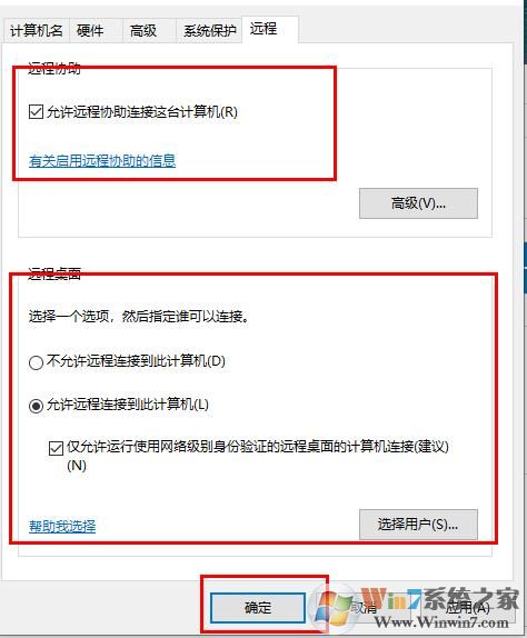 4、点击“远程”勾选“允许远程协助连接这台计算机”和“允许远程连接到此计算机”点击“确定”这样我们这台电脑就允许其它电脑远程协助了。