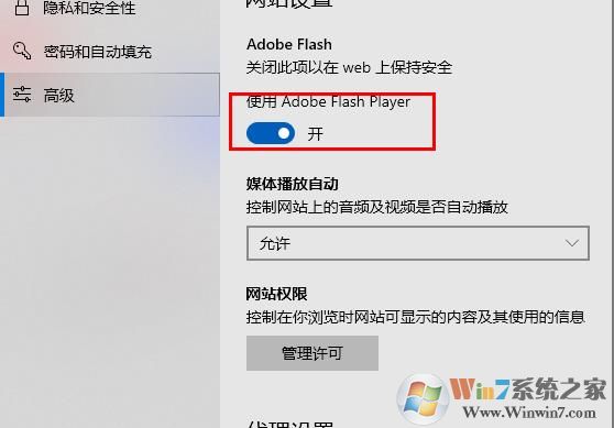 3、在右侧“网站设置”中找到“使用 adobe flash player”。默认为关,设置为开启。
