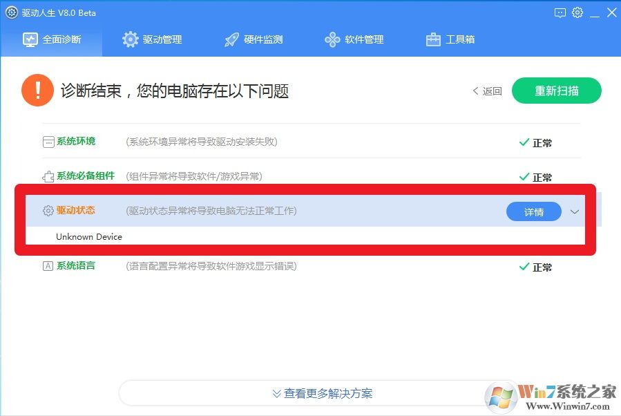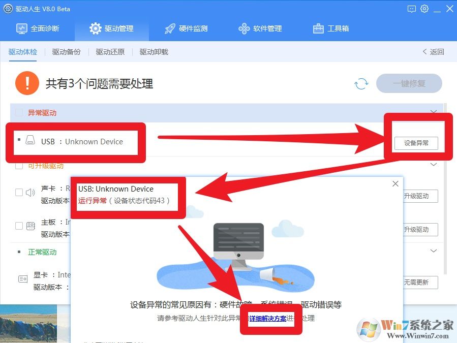 2、在驱动体检后发现USB设备异常——点击设备异常——点击详细解决方案即可。