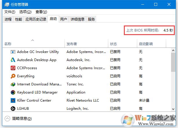 2.     在“启动”标签页,可以查看“BIOS”启动时间,这里可以理解为电脑硬件层面上的启动