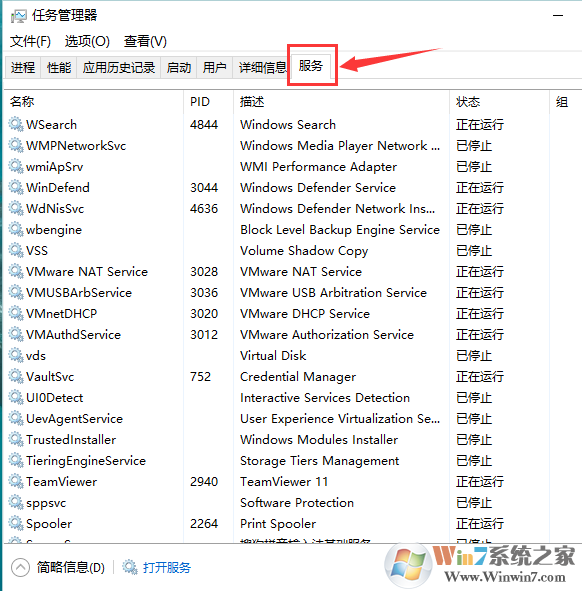 2、打开Windows 10系统的任务管理器页面之后,点击页面右上角顶端的“服务”选项卡,打开Windows系统服务页面。