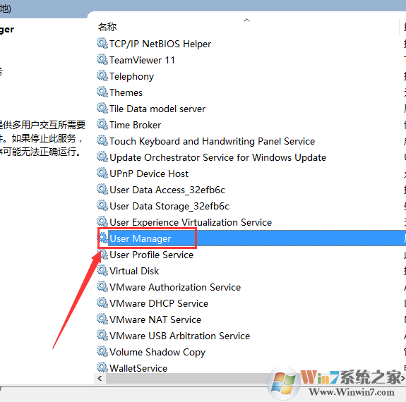 4、在Windows系统服务列表中,点击查找服务列表中的“User Manager服务”,然后双击并打开该服务配置页面。