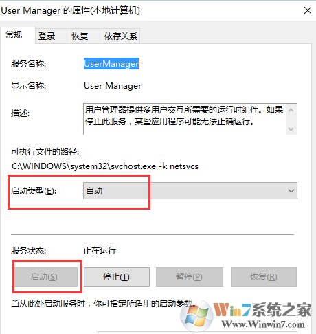 5、在User Manager服务配置页面中,点击页面中的“启动”选项,用以启动该服务,并将该服务设置为“自动启动”模式,设置完毕之后,我们就可以注销当前登陆的系统账户,再重新登录账户之后即可恢复正常。