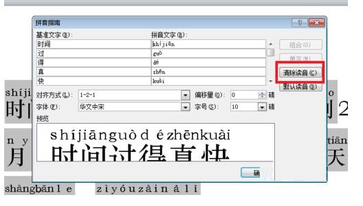 6、这样整骗文章就都加注上拼音了,如果我们想取消拼音,可以选择在拼音指南设置中,点击“【消除读音】就可以取消了。
