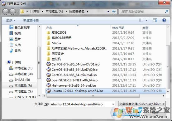 2、进入软碟通,进行如下操作 选择文件,并且打开你下载的 UBUNTU 所在的目录,选择 unbuntu 镜像(改成选择Ubuntu Kylin 15.04镜像即可),选择打开,如图: