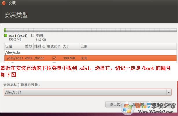 然后在安装启动的下拉菜单中找到 sda1,选择它,切记一定是/boot 的编号 如下图