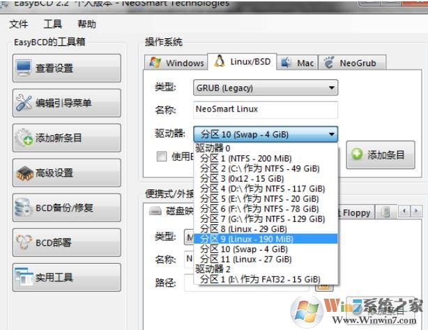得到如图,选择有企鹅那个,也就是 LINUX/BSD 那个选项,在磁盘驱动器那个下拉菜单选 择以 linux 开头,大小为 200M 左右的那个选项,如图