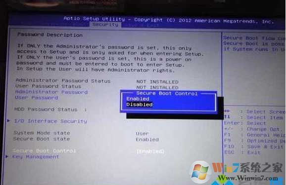 2、使用→方向键移动到Security,选择Secure Boot Control按回车,修改成Disabled;