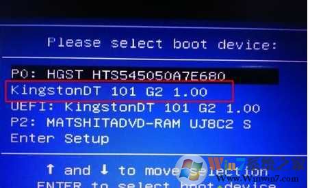 4、插入U盘启动盘,重启过程中不停按ESC键,在弹出的启动项选择菜单选择识别到U盘启动项,按回车进入;