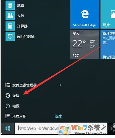 1、点击桌面左下角的“开始”菜单,从弹出的扩展菜单列表中点击“设置”按钮。