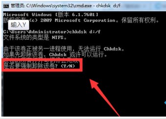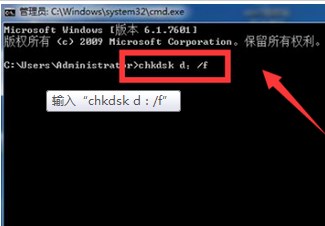 2、在窗口中输入“chkdsk d:/f” ,回车,(这是修复D分区,D前有空格),(有几个盘符可以输几次,输完回车再输下一个);