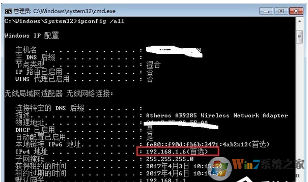 4、在弹出的黑框中输入“ipconfig /all”,注意里面的斜杠是“/”不是“\”,在按“Enter”回车键,如下图所示。红色方框为电脑的IP地址,下面就是子网掩码和默认网关等信息。