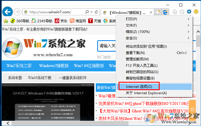 1、点击IE浏览器工具栏上的“齿轮图标”,打开“Internet选项”。