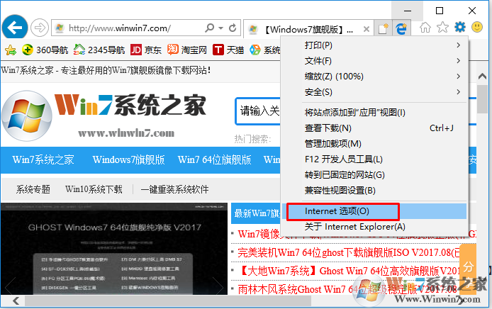 1、点击Internet Explorer窗口右上角的设置(齿轮形状的)按钮,然后点击Internet选项;