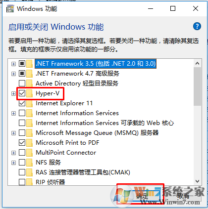4、将虚拟机服务Hyper-V前的打勾去掉,点击确定。