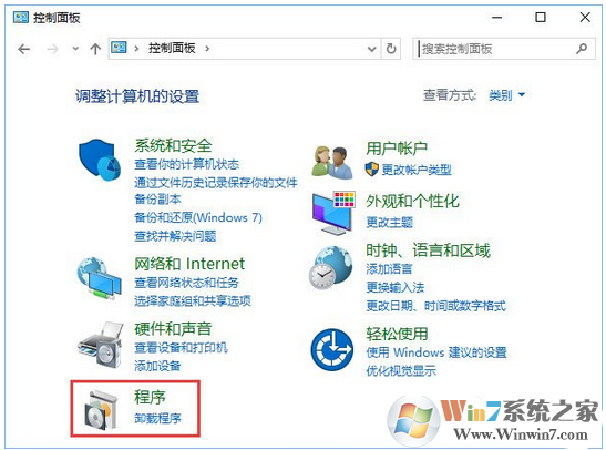 2、打开控制面板后,点击绿色字体“程序”。