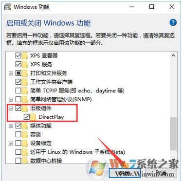4、点击启用或关闭Windows功能后,会弹出Windows功能对话框,拉到最下面,点击“+”展开“旧版组件”,勾上“DirectPlay”,再点击确定。