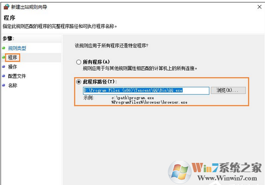 4、点击“程序”--浏览--找到需要阻止访问网络的程序。
