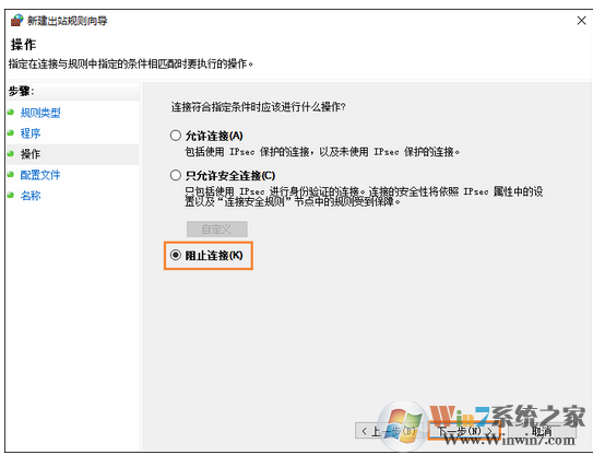 5、找到需要禁止的程序,勾选“阻止连接”,然后按照提示完成操作就可以了。