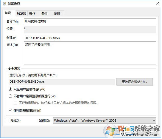 2、创建任务的功能丰富得多,还可以使用最高权限运行,同样填写名称和描述。