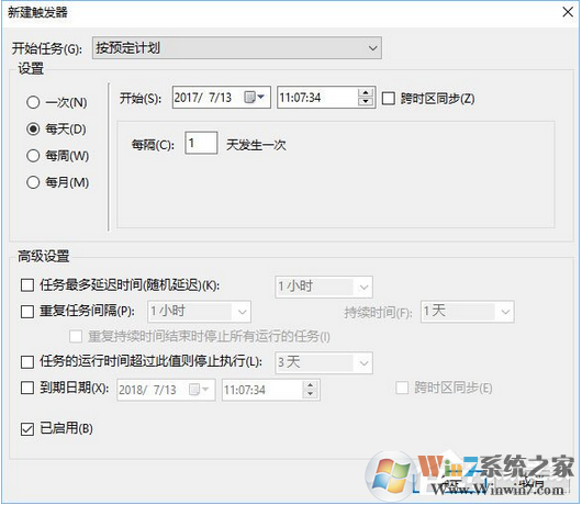 3、点击顶部的选项卡,切换到触发器,新建一个触发器,可以看到能选的实在太多了,小编选择了按照预定时间,每天11:07:34都会执行,我们继续往下看。
