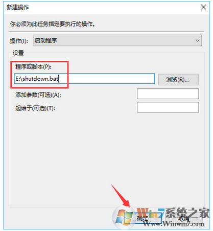 5、选择一个操作,小编选择启动程序,然后选择一个批处理,因为我们的批处理不用传参,可选参数就不管了,直接下一步。