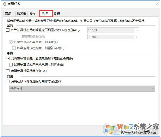 5、这个时候就发现了,这里可以设置很多条件,比如计算机空闲的时候执行,唤醒计算机执行,简直太棒了。