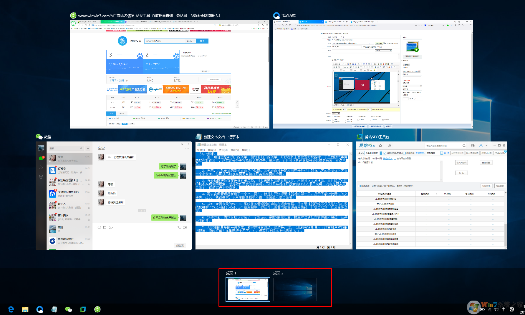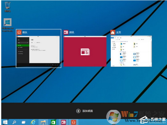 2、下面重点要说的是虚拟桌面也就是多桌面这个功能,我们可以创建多个桌面,同时按下win+tab键我们就可以在右下角发现一个新建桌面的标志,新建桌面之后任务栏上将看不到任何的任务以及程序,我们可以利用这个功能将工作、学习和游戏完全分隔开。避免工作的情况下受到游戏的影响。