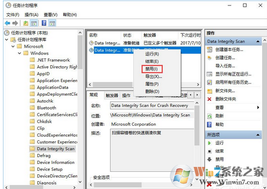 3、在左侧依次展开:Microsfot\Windows\Data Integrity Scan ,在右侧的“DataIntegrity Scan for Crash Recovery”上单击右键,选择【禁用】;