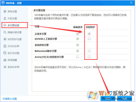 2、点击【多引擎设置】,在右侧将所有实时防护的勾去掉;