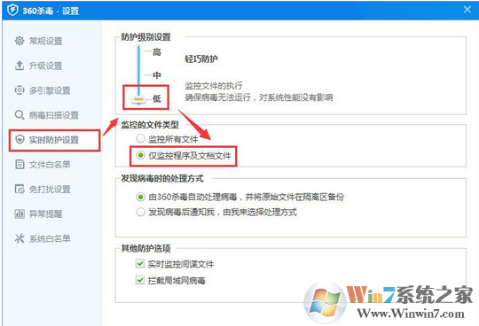 3、切换到【实时防护设置】,将防护级别设置跳到“低”,将监控的文件类型修改为“仅监控程序及文档文件”;
