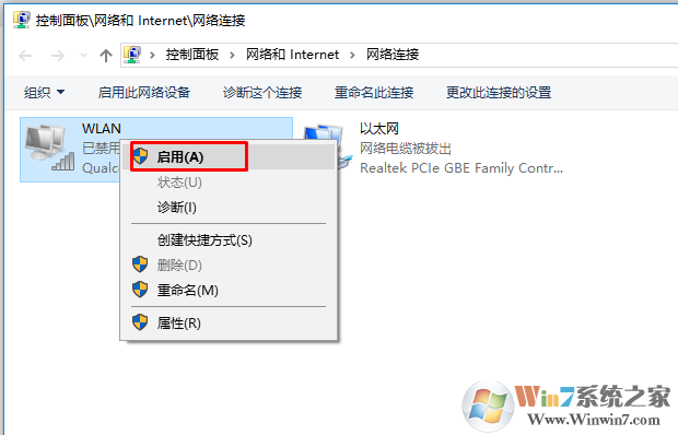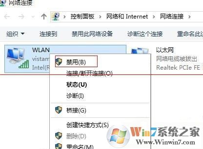 4、我们要找的是WLAN的连接,右键点击它,选择"禁用",待图标变成灰色后,再次将其"启用",这样,无线网就可以重新连接了。