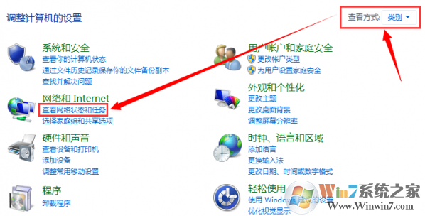 1、右键点击开始菜单,打开控制面板,在查看方式为"类别"的状态下,点击"查看网络状态和任务",如下图所示: