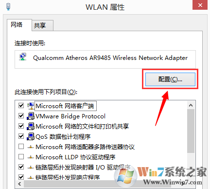 3、然后在打开的WLAN属性窗口中选择“配置”:再在打开的窗口中选择“电源管理”选项卡:取消对“允许计算机关闭此设备以节约电源”的勾选,再点击“确定”即可。