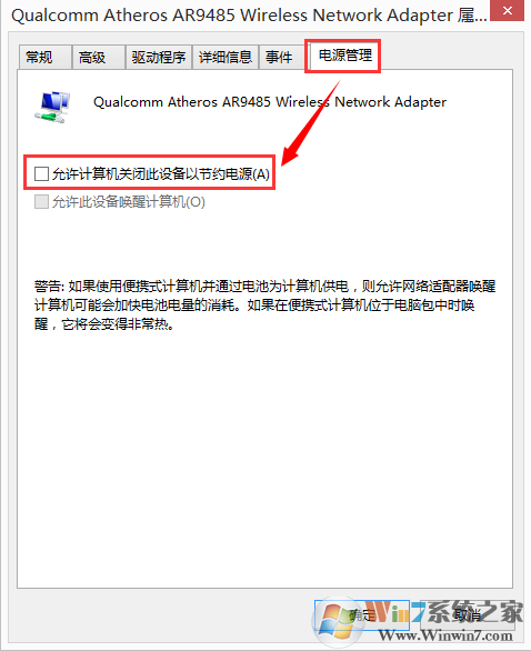3、将"允许计算机关闭此设备以节约电源"前面的勾去掉,然后点击确定即可。