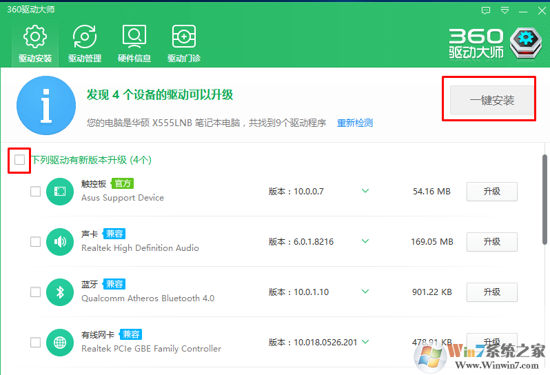 下载安装360驱动大师、驱动精灵等第三方驱动软件对电脑检测和更新驱动。
