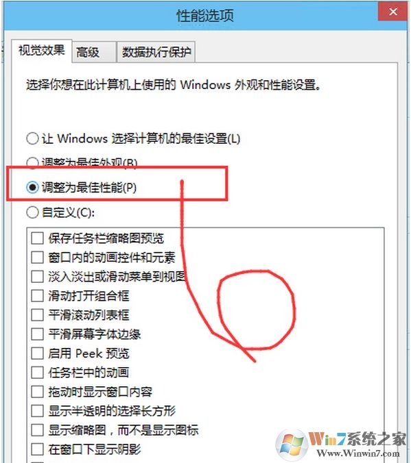 3、在性能选项的视觉效果栏里可以看到有4种设置模式。设置调整为最佳性能模式。
