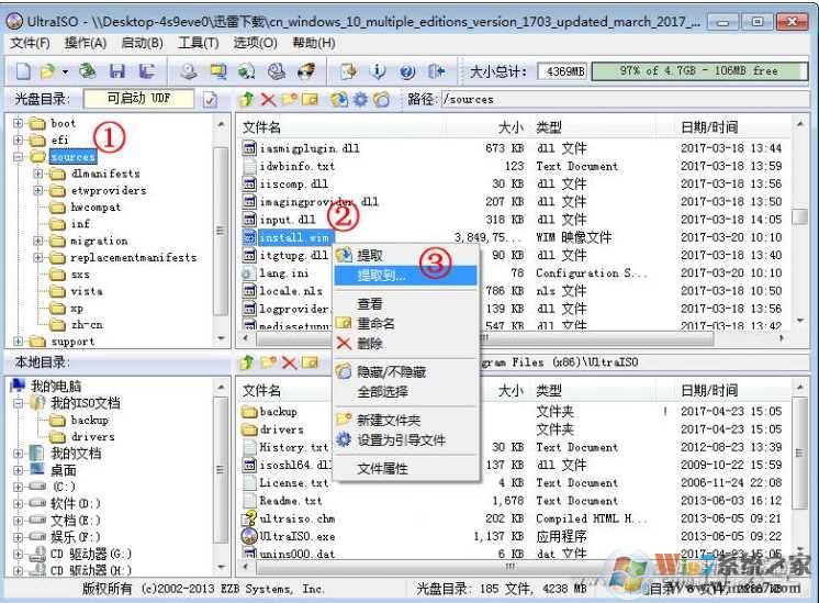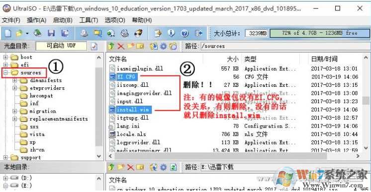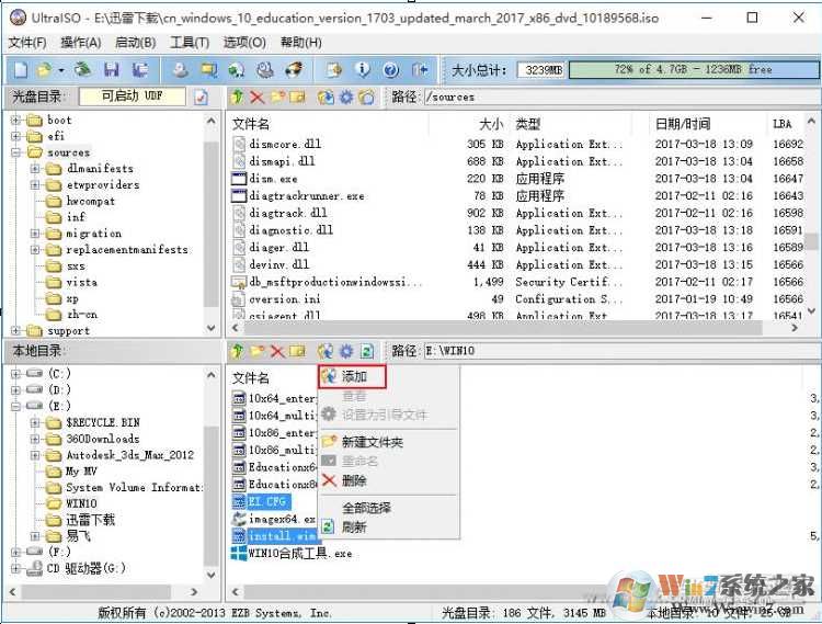 4、用UltraISO工具替换cn_windows_10_multiple_editions_version_1703_updated_march_2017_x86_dvd_10189569.iso 中的 install.wim 和 EI.CFG 文件