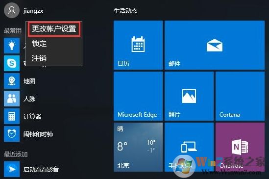 1、首先点击开始菜单,点击最顶部的用户头像,然后点击“更改账户设置”;如图所示: